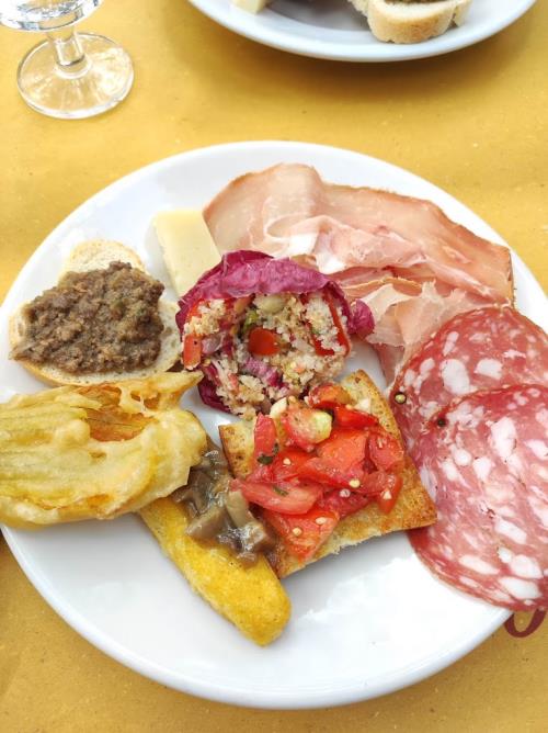 Il menù prevede una carrellata di sapori che partono dal nostro antipasto toscano "da Giocondo", proseguendo con un assaggio di primi e terminando con un secondo di carne a scelta tra l'arrosto, grigliata o tagliata di vitella, accompagnato dai nostri contorni di verdure fritte o grigliate. Nel caso in cui il contorno sia di soli funghi fritti o grigliati è previsto un sovrapprezzo di € 3,00.